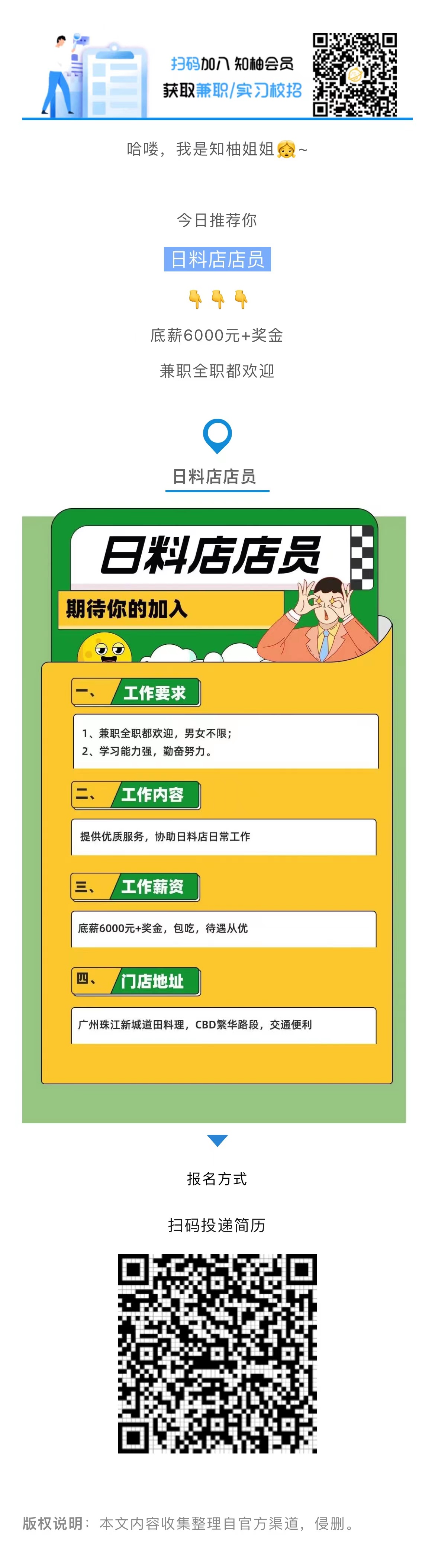 | 广州日料店店员招募!底薪6000元+奖金+包吃,全职/兼职都可以! |