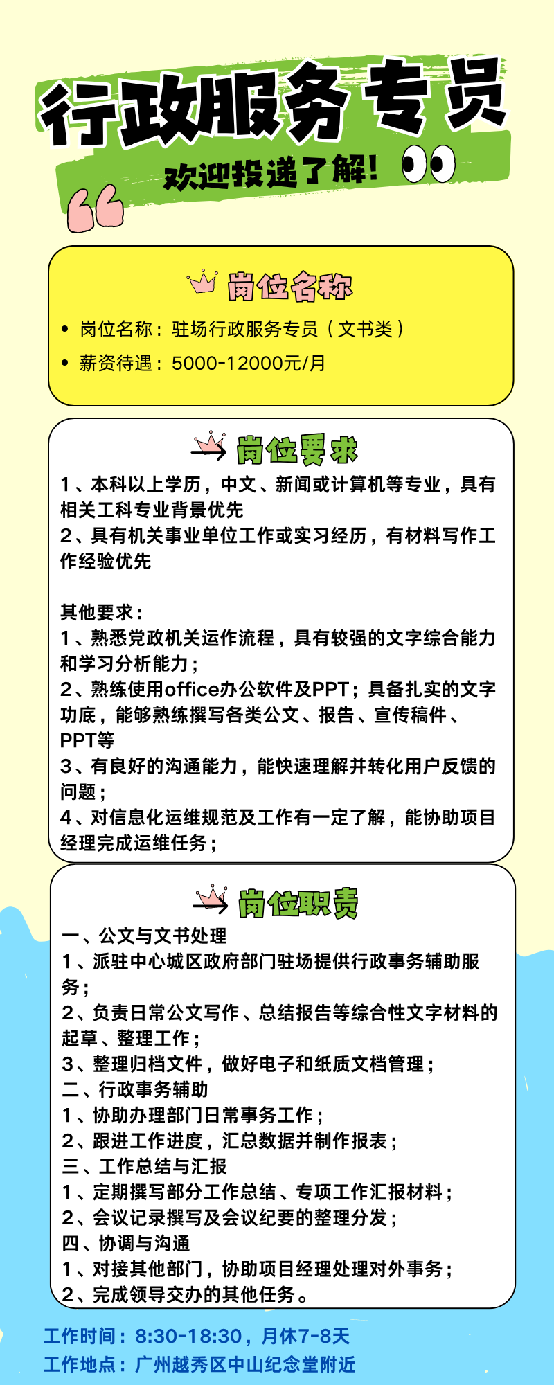| 【广州越秀全职】月薪5000-12000元/月,招募文书类驻场行政人员,需要扎实的文书经验者! |